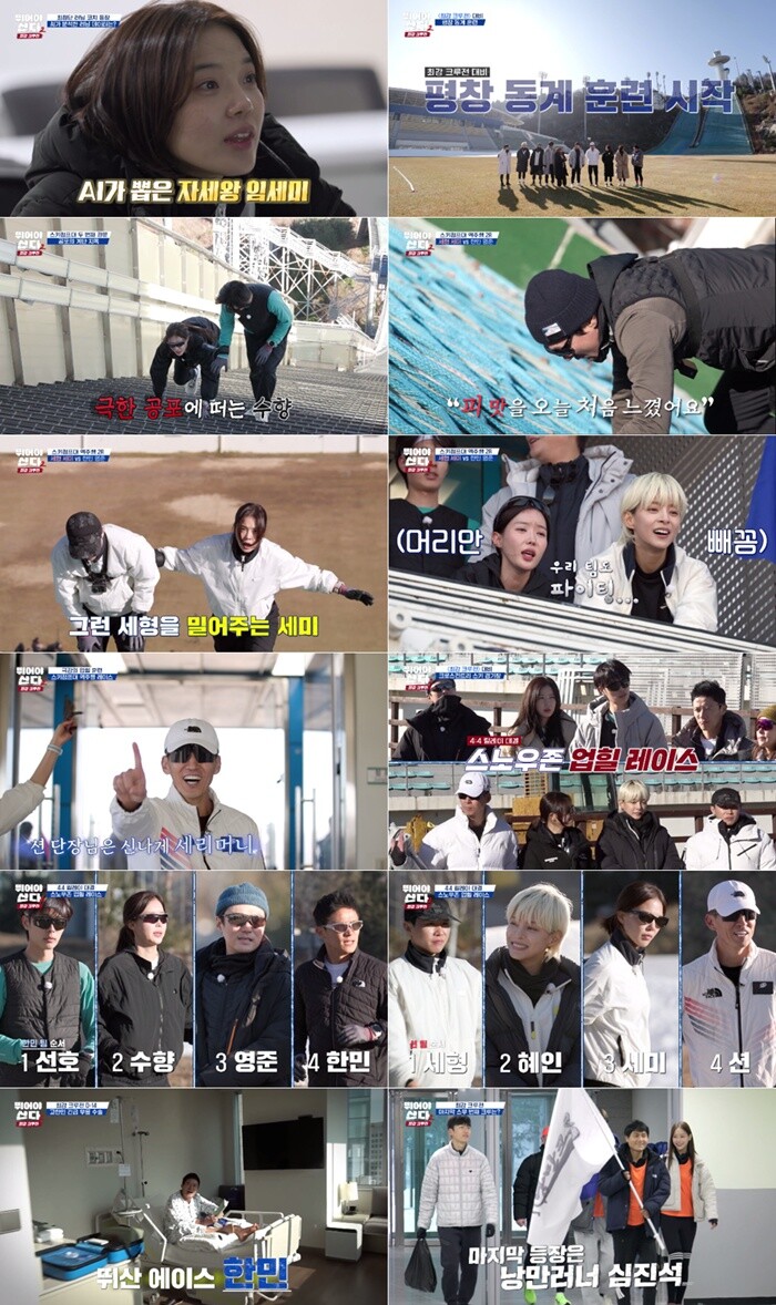 하얀 눈이 뒤덮인 평창에 모인 뛰산 크루는 앞서 홍천 마라톤 때 착용했던 ‘센서 조끼 데이터’를 바탕으로 각자의 러닝 자세와 습관을 점검, 교정하는 시간을 가졌다. 이후 첫 번째 훈련인 ‘스키점프대 역주행 레이스’가 선포돼 본격 훈련에 돌입했다. 평균 경사 35도, 최대 약 138m 높이에 달하는 스키점프대를 역주행해야 하는 고난도 코스에 ‘뛰산 크루’는 입을 떡 벌렸고, 이들은 션 팀(션, 정혜인, 임세미, 양세형)과 고한민 팀(고한민, 최영준, 임수향, 유선호)으로 나뉘어 2인 1조 릴레이 대결을 벌였다. 션은 “그간 팀 대결에서 이상하게 많이 져서 꼭 승리하고 싶다. 이영표 부단장이 없으니 오늘은 저희 팀이 앞서지 않을까”라며 자신의 파트너인 정혜인과 초반부터 치고 나갔다. 그런데 정혜인이 레이스 중 고소공포증으로 힘들어했고, 이에 션은 손을 내밀어 계단 구간을 함께 올랐다. 팀워크로 위기를 극복한 결과, 두 사람은 고한민 팀의 임수향, 유선호를 제치고 먼저 정상에 올랐다.