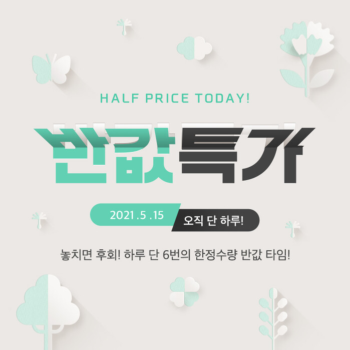 반값특가 상품은 15일 오전 0시부터 하루 6번(0시, 9시, 12시, 15시, 18시, 21시) ‘타임딜’을 통해 공개한다. 시간대별 10개씩, 하루 동안 총 60개 반값 상품을 한정 수량으로 판매한다.