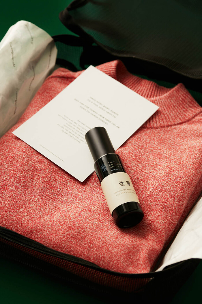특별 구성된 린넨 스프레이는 반얀트리의 시그니처 향, 타이 차마나드 플로럴 향이 특징으로, 자주 세탁하기 어려운 고급소재 스웨터 관리에 더욱 유용하다. 가볍게 뿌려 놓으면 탈취 효과가 있고, 깊고 부드러운 잔향이 오래도록 남아 스웨터 착용 시 포근한 느낌을 더한다. 또한, 린넨 스프레이는 먼싱웨어에서 자체 제작한 스페셜 메쉬 파우치에 담아 증정한다.