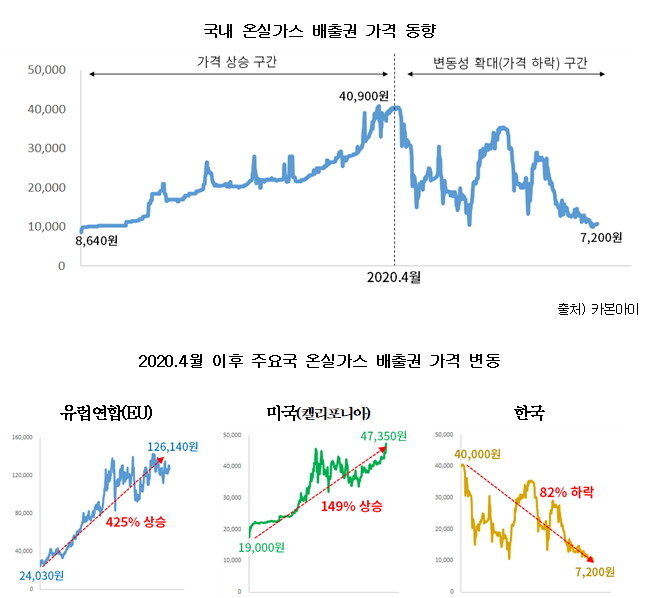 지난해 우리나라 온실가스 배출량은 6억 5500만톤으로 잠정 집계됐으며, 2018년 대비 10% 하락했지만, 배출량 감소만으로 배출권 가격 급락을 설명할 수는 없다는 게 대한상의의 설명이다. 코로나19 영향으로 유럽연합(EU)과 미국 등 주요국도 배출량이 감소했지만, 2020년 4월 이후 유럽은 400% 이상, 미국은 150% 가까이 배출권 가격이 상승했기 때문이다.