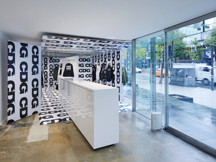 1층은 볼드한 타이포그래피 로고가 새겨진 CDGCDGCDG 라인으로 구성했고, 2층과 4층에는 엘레나 도슨(Elena Dawson), 에꼴 드 큐리아서티(Ecole de Curiosites), 아이레이(AIREI) 등 새로운 디자이너 브랜드 상품을 갖췄다. 5층에는 아오야마 백을 포함해 지갑, 향수 등 꼼데가르송의 액세서리/라이프스타일 상품을 구성해 다채로운 브랜드 경험을 위한 공간을 마련했다. 고객이 매장 안에 있는 모든 브랜드 상품과 콘텐츠를 놓치지 않고 볼 수 있도록 전 층의 동선을 구축해 갤러리에 온 것 같은 느낌을 강조했다.
