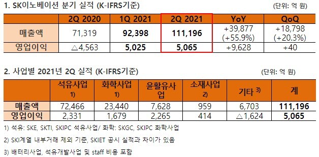 SK이노베이션이 역대 최고 실적을 기록한 윤활유 사업과 배터리 부문 손익 개선으로 2분기 역시 준수한 성적표를 받았다.