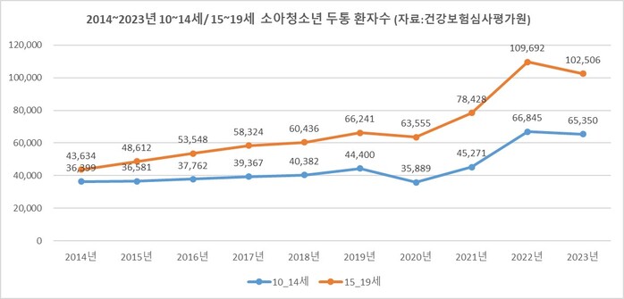 2014년 43,634명이었던 15~19세 두통 환자수가 2023년에는 102,506명으로 늘어나 최근 10년사이 2.4배 증가했고, 10~14세의 환자도 2014년 27,271명에서 2023년 65,350명으로 1.8배 늘었다.