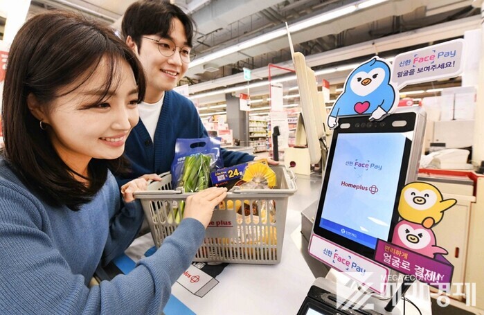 ▲ 신한카드(사장 임영진)는 홈플러스(대표 연태준)와 함께 대형 유통점 최초로 얼굴 인식만으로 결제와 멤버십 포인트 적립이 가능한 서비스를 홈플러스 월드컵점에 론칭한다. [사진=홈플러스, 신한카드제공] |