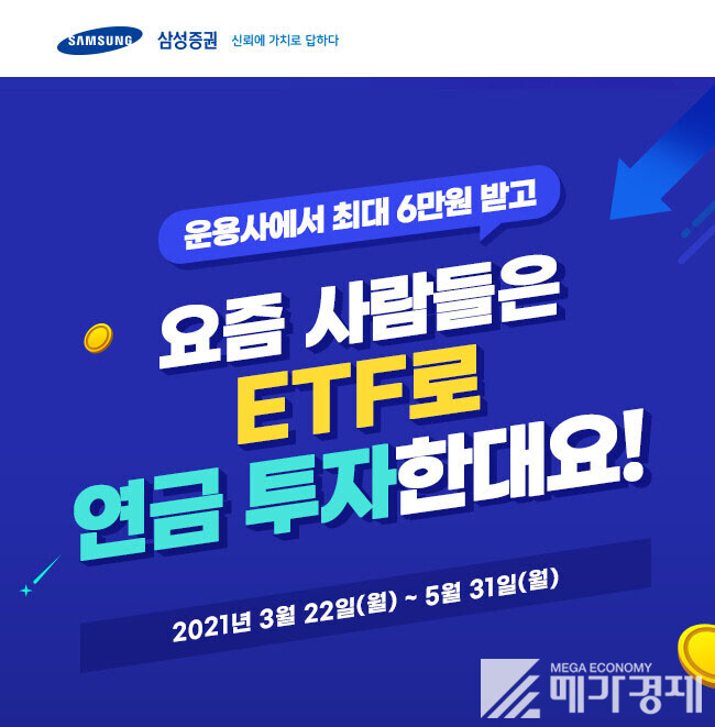 ▲ 삼성증권(사장 장석훈)은 연금계좌에서 상장지수펀드(이하 ETF)를 거래하는 고객을 대상으로 상품권을 제공하는 이벤트를 5월 31일까지 진행한다 |