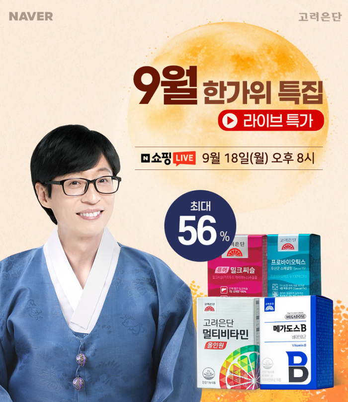 당일 오후 8시부터 약 1시간 동안 진행되는 네이버 쇼핑라이브에서는 △멀티비타민 올인원 △메가도스B 비타민B군 △프로바이오틱스 유산균 스페셜핏 △퓨어 밀크씨슬 등 소비자들의 다양한 수요에 맞춘 고려은단 인기 건기식 제품들을 소개할 예정이다. 방송 중 구매 인증과 제품 기대평을 댓글로 남기면 추첨을 통해 ‘고려은단 럭키박스’를 증정하는 이벤트도 진행한다.