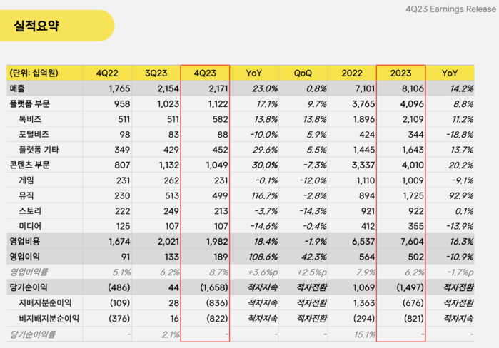 사업 부문별로 살펴보면 카카오의 2023년 4분기 플랫폼 부문 매출은 전 분기 대비 10%, 전년 동기 대비 17% 증가한 1조1,217억 원으로 집계됐다.