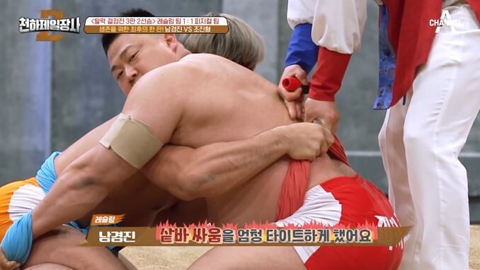 이윽고 ‘승자연전제’로 치러지는 연합대전이 시작됐다. 김동현은 레슬링팀-피지컬팀 연합을 향해 “좀 있다가 둘이 붙어야 하니까 친하게 계시지 말라”며 자존심 파괴 도발을 날려 남경진의 심기를 건드렸다. 이에 분기탱천한 남경진이 선발로 출전했고, 김동현도 모래판에 나서 드디어 맞대결이 성사됐다. 경기 직전 김동현은 남경진에게 “호랑이 사냥꾼 임꺽정을 잘 만나셨다”며 살벌한 도발을 날렸다. 두 선수는 샅바싸움부터 서로 밀치는 등 과격한 모습을 보였다. 하지만 실제 경기는 1초 만에 끝났고, 주심은 VAR 판독 요청을 했다. 응원전이 폭발한 가운데, 남경진의 왼쪽 팔꿈치가 먼저 닿은 것으로 판독돼 김동현의 승리로 돌아갔다.