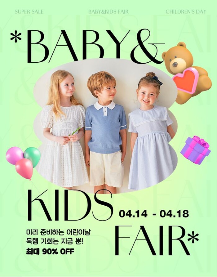 5월 어린이날 연휴를 앞두고 아이들 선물을 미리 준비하려는 고객 수요를 겨냥한 것으로, 바람막이, 원피스, 트레이닝 상하복 등 봄 패션 아이템은 물론, 육아용품과 키즈카페, 놀이공간 티켓까지 약 300개의 상품을 합리적인 가격에 선보인다.