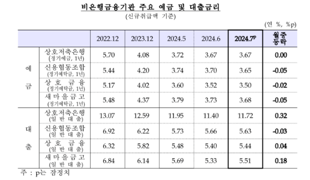 한편, 비은행금융기관에서 수신금리는 대체로 하락했지만 상호저축은행을 제외하고 신용협동조합(신협), 상호금융, 새마을금고 모두 하락했다. 대출금리는 신협을 제외하고 모두 상승했다.