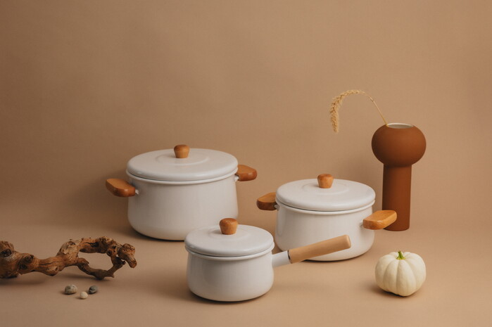 코닝웨어가 새롭게 선보인 ‘코닝웨어 플레인 법랑 쿡웨어’는 법랑 냄비 특유의 빈티지한 감성이 깃든 디자인이 특징이다. 어떤 주방 인테리어든 잘 어울리는 우유빛 색상과 우드 핸들로 세련되면서도 따뜻한 감성을 더했다.