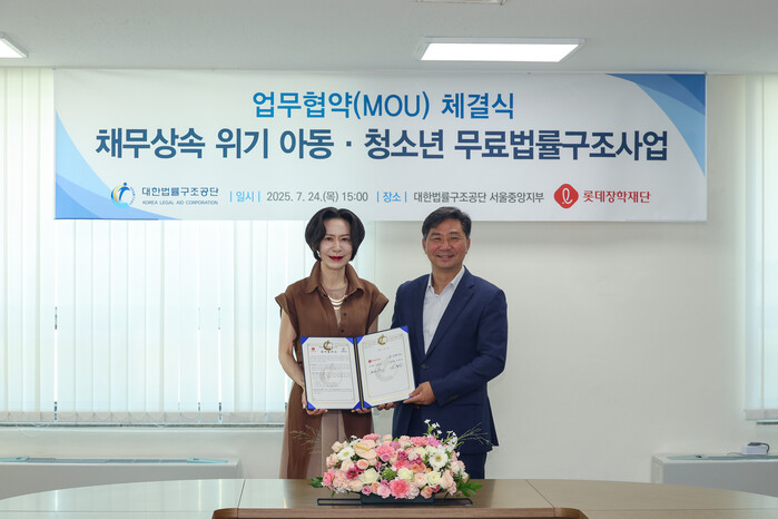 [메가경제=주영래 기자] 롯데장학재단(이사장 장혜선)이 대한법률구조공단과 손잡고 채무상속 위기에 처한 아동·청소년을 대상으로 한 법률구조 지원에 나선다. 재단은 올해 처음으로 ‘채무상속 아동·청소년 무료법률구조사업’을 시행하며, 약 5,000만 원의 예산을 투입해 중위소득 125% 이하 24세 이하 아동·청소년이 상속포기 및 한정승인 등 법적 절차를 지원받도록 돕는다.