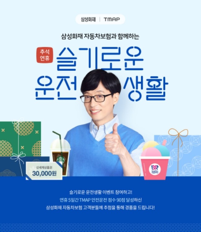 삼성화재가 추석연휴 안전 운전을 장려하기 위한 이벤트를 진행한다. 삼성화재 자동차보험 계약자·피보험자면 참여가 가능하고 티맵(TMAP)을 사용해 100Km 이상 주행하고, 안전점수 90점 이상을 획득하면 경품을 제공한다.