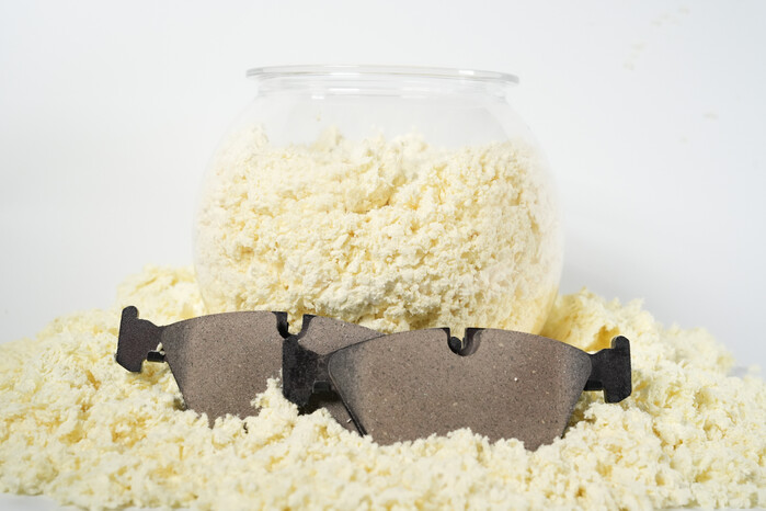 ▲ 코오롱인더스트리 아라미드 펄프와 자사 제품을 적용한 유기계(NAO) 브레이크 패드. [사진=코오롱인더스트리 제공] |