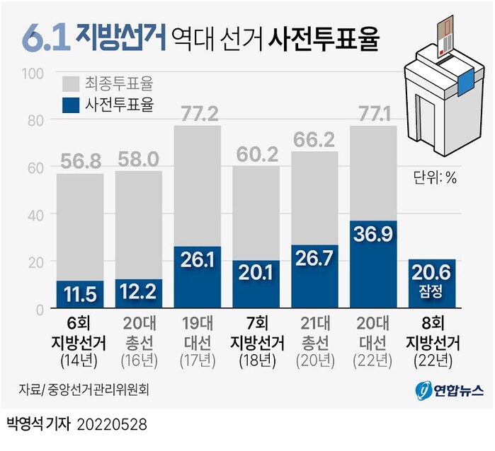 | ▲ 중앙선거관리위원회는 27일부터 이틀간 진행된 제8회 전국동시지방선거 사전투표 결과 최종 20.62%를 기록했다고 밝혔다. [그래픽=연합뉴스] |