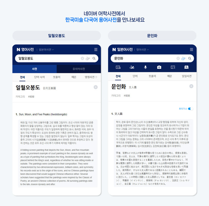 더 많은 이용자들이 미술 관련 용어를 쉽게 이해하고 활용할 수 있도록, 네이버와 예술경영지원센터는 지난 7월 ‘한국미술 다국어 용어사전의 대국민 서비스 확대’를 위한 업무협약을 체결했다. 이제 네이버 어학사전에서 ‘문인화’, ‘일월오봉도’ 등 6000여 미술 용어를 정확한 다국어 표기와 함께 만나볼 수 있다.