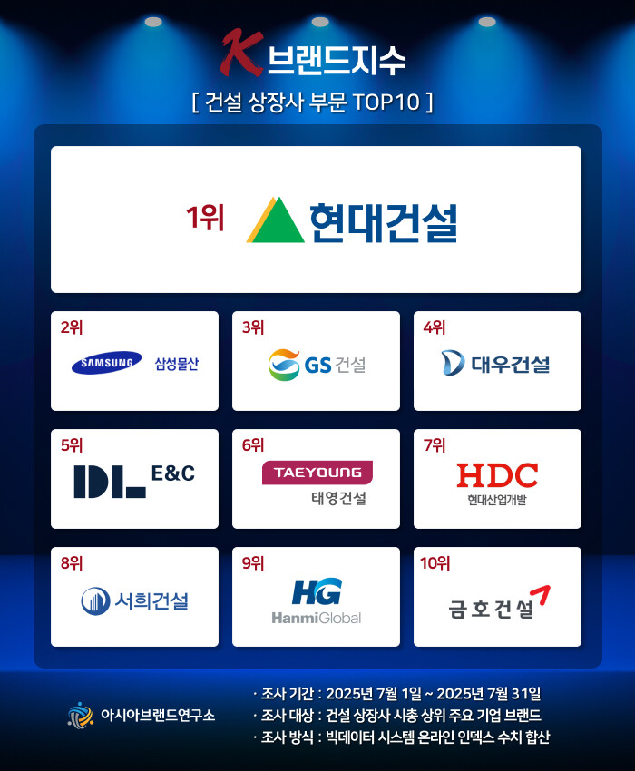 K-브랜드지수 건설 상장사 부문은 현대건설이 1위를 차지했으며, 삼성물산(2위), GS건설(3위), 대우건설(4위), DL이앤씨(5위), 태영건설(6위), HDC현대산업개발(7위), 서희건설(8위), 한미글로벌(9위), 금호건설(10위)이 TOP10에 이름을 올렸다.