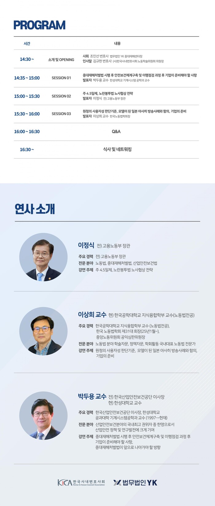 [메가경제=주영래 기자] 최근 ‘노란봉투법’(노동조합 및 노동관계조정법 개정안) 통과와 중대재해처벌법 제도 개선, 주 4.5일제 도입 논의 등 노동정책의 급격한 변화가 예고된 가운데, 법무법인 YK와 한국사내변호사회가 공동으로 관련 세미나를 개최한다.