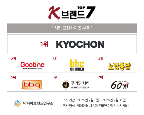 2025년 7월 1일부터 31일까지의 온라인 빅데이터 1649만 9935건을 대상으로 조사된 ‘K-브랜드 톱7’ 치킨 프랜차이즈 부문은 트렌드(Trend)·소셜(Social)·미디어(Media)·커뮤니티(Community)·긍부정(Positive/Negative) 인덱스 등의 핵심 빅데이터에 대한 가중치 배제 합산 수치로 산출됐다.