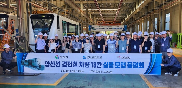 [메가경제=문기환 기자] 부산교통공사가 지난  12일 충북 청주시 소재 우진산전 공장에서 공사 직원 및 양산시 관계자를 대상으로 부산 노포와 양산 북정 간 운행될 양산선에 투입될 경전철 차량을 실물 모형(Mock-up, 목업)으로 미리 확인하고 의견을 개진하는 품평회를 열었다고 밝혔다.