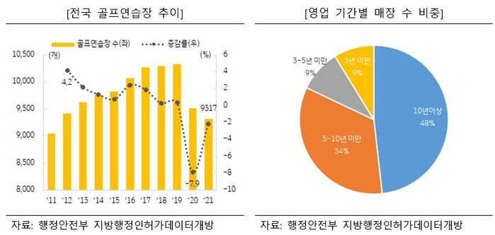 골프연습장은 전국에 약 9300여곳이 영업 중이다. 평균 영업기간은 9.4년으로 비교적 자영업 중 길다.
