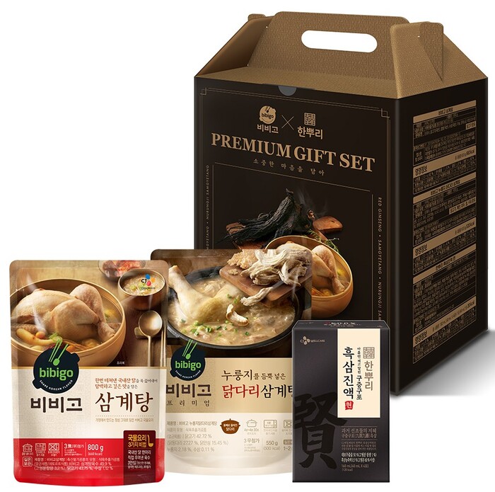 이 제품은 다가오는 중복을 맞아 ‘보양’ 콘셉트로 ‘카카오 선물하기’를 통해 한정으로 선보인다. 닭 한 마리가 통째로 들어간 ‘비비고 삼계탕’과 닭다리 중심의 ‘비비고 누룽지닭다리 삼계탕’, 그리고 '한뿌리 흑삼진액 현(40ml)'으로 구성됐다. (소비자가 22,900원) 건강에 관심 많은 젊은 2030세대를 중심으로 특히 관심을 모을 것으로 기대된다.