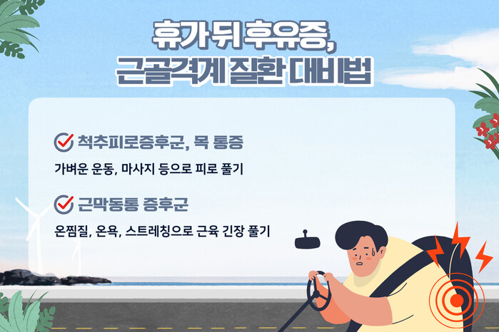 [메가경제=주영래기자] 여름휴가를 마치고 후유증으로 목과 허리 등이 뻐근하고 아프다며 증상을 호소하는 사람들을 종종 볼 수 있다. 장시간 운전을 하거나 비행기에 앉아 있는 경우 피로가 누적돼 근육통이나 피로 증후군 등을 호소하는 경우다.