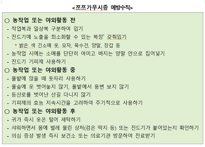 ▲ 쯔쯔가무시증 예방수칙. [질병관리청 제공] |