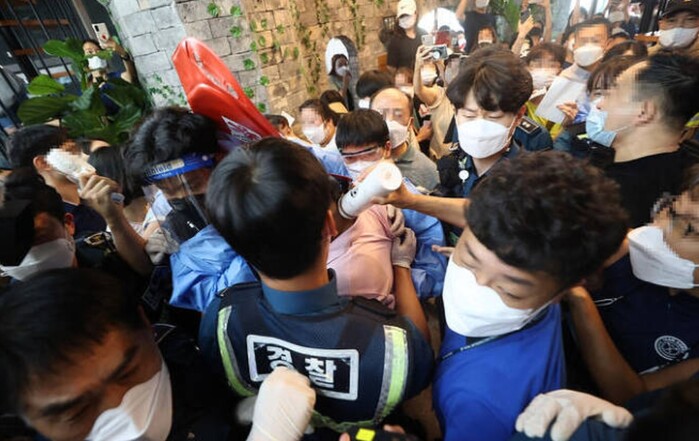 ▲ 지난 13일 서울 영등포구에 위치한 '머지포인트' 운영사 머지플러스 본사에서 포인트 환불을 요구하는 고객 수백여명이 모여들어 거세게 항의하며 혼란이 빚어지자 경찰까지 출동했다. [사진=연합뉴스] |