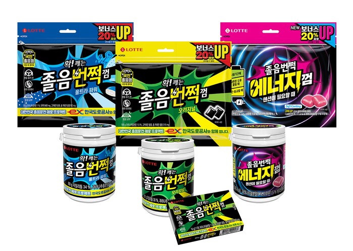롯데웰푸드 졸음번쩍껌은 수험생, 운전자, 야간근무자 등 졸음을 쫓아야 하는 소비자를 위한 껌이다. 휘산작용으로 입안에 시원한 느낌을 주는 멘톨 성분과 천연카페인 성분 과라나추출물이 함유돼 졸음을 이겨내는데 도움을 준다.