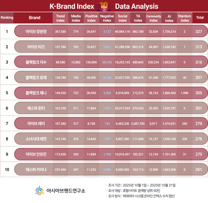이번 K-브랜드지수 걸그룹 개인 부문은 포털사이트 검색량 상위 50인을 대상으로, 2025년 10월 1일부터 10월 31일까지의 온라인 빅데이터 6억 8864만 1587건을 분석했다.