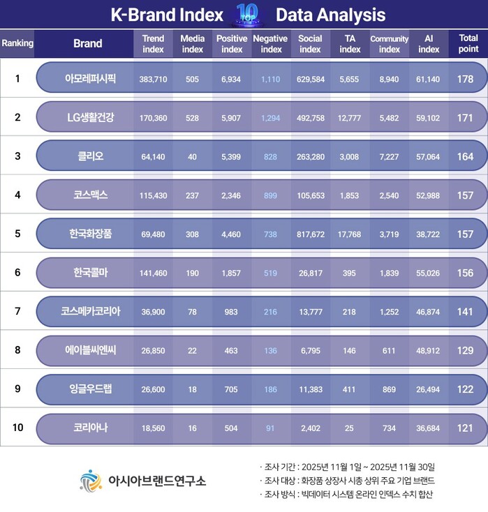 이번 K-브랜드지수 화장품 상장사 부문은 화장품 상장사 시총 상위 주요 기업 브랜드를 대상으로, 2025년 11월 1일부터 11월 30일까지의 온라인 빅데이터 537만 7360건을 분석했다.