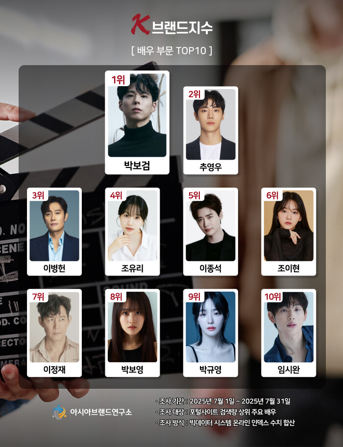 이번 K-브랜드지수 배우 부문은 포털 사이트 검색량 상위 주요 배우를 대상으로, 2025년 7월 1일부터 7월 31일까지의 온라인 빅데이터 2억 4380만 9460건을 분석하여 진행됐다.