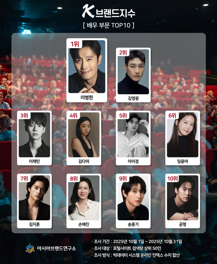 이번 K-브랜드지수 배우 부문은 포털사이트 검색량 상위 50인을 대상으로, 2025년 10월 1일부터 10월 31일까지의 온라인 빅데이터 1억 7438만 8660건을 분석했다.