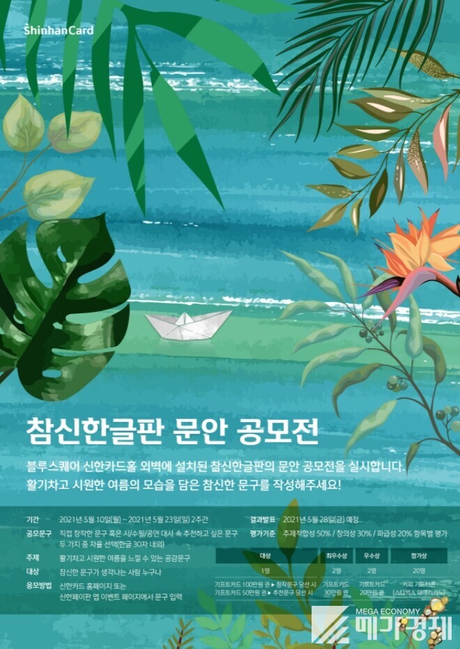 첫 공모전인 이번 2021년 여름편의 주제는 ‘활기차고 시원한 여름을 느낄 수 있는 공감문구’로 5월 10일부터 23일까지 신한카드 홈페이지와 신한PayFAN (신한페이판) 앱 이벤트 페이지 게시글의 안내에 따라 응모하면 된다.