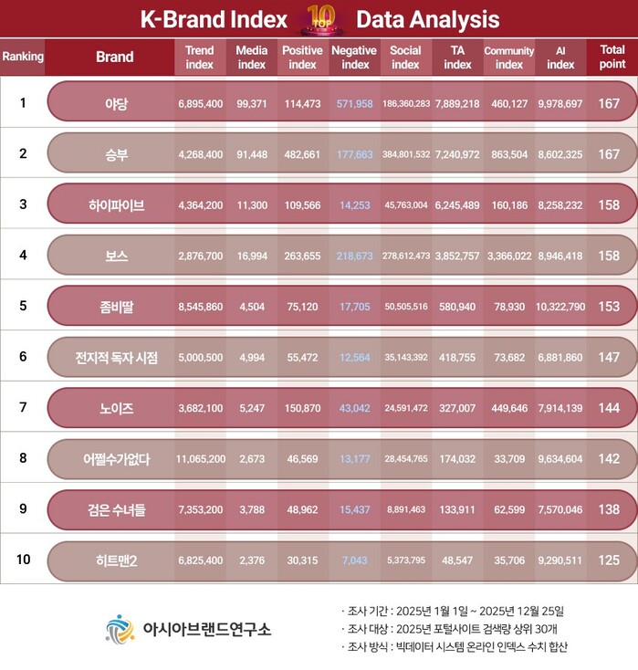 이번 K-브랜드지수 올해의 영화 부문은 2025년 포털사이트 검색량 상위 30개를 대상으로, 2025년 1월 1일부터 12월 25일까지의 온라인 빅데이터 14억 7252만 4614건을 분석했다.