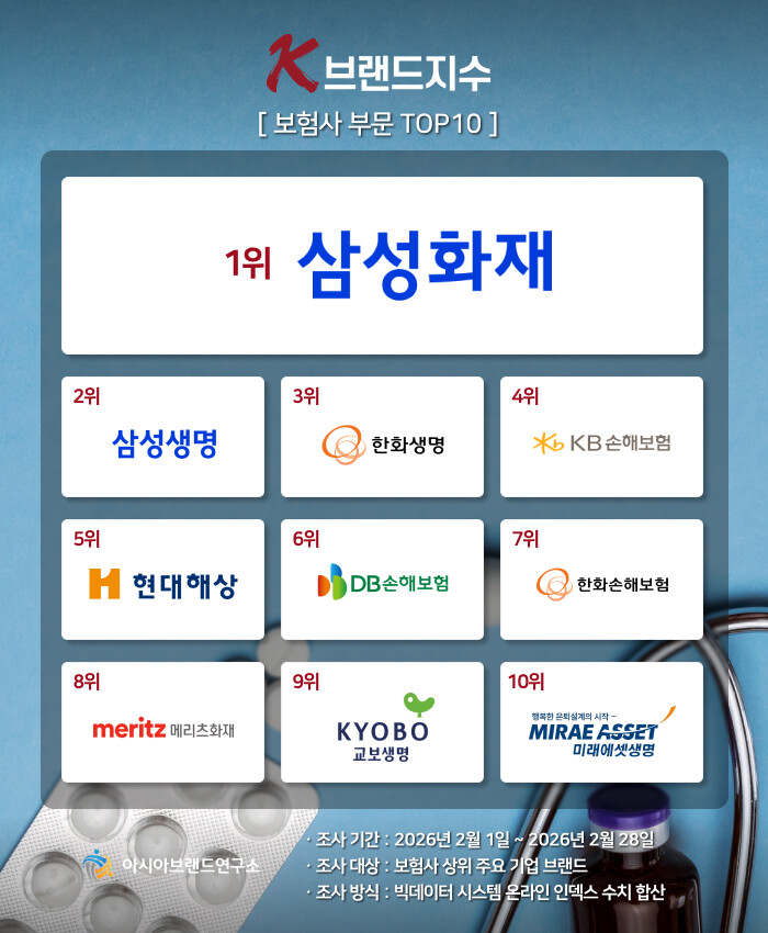 한정근 아시아브랜드연구소 대표는 “최근 급변하는 금융 환경 속에서 자산 보호와 미래 대비를 향한 소비자들의 신뢰도가 보험사 브랜드 밸류에 입체적으로 반영되고 있다. 1위부터 3위까지 최상위권을 굳건히 수성한 삼성화재, 삼성생명, 한화생명의 3강 체제는 장기간 축적된 자본력과 고객 충성도를 빅데이터를 통해 증명된 것"이라고 설명했다.