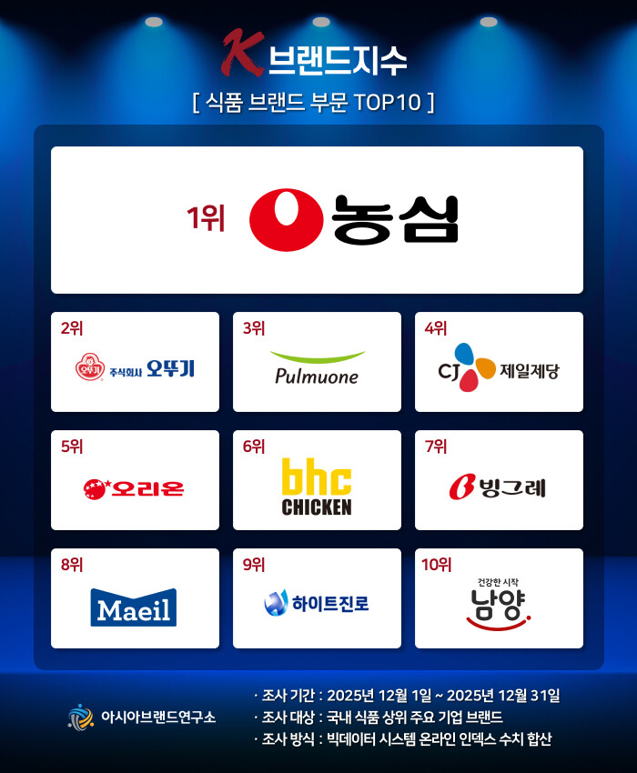 K-브랜드지수 식품 브랜드 부문은 1위 농심에 이어 오뚜기(2위), 풀무원(3위), CJ제일제당(4위), 오리온(5위), BHC(6위), 빙그레(7위), 매일유업(8위), 하이트진로(9위), 남양유업(10위) 등이 TOP10에 이름을 올렸다.
