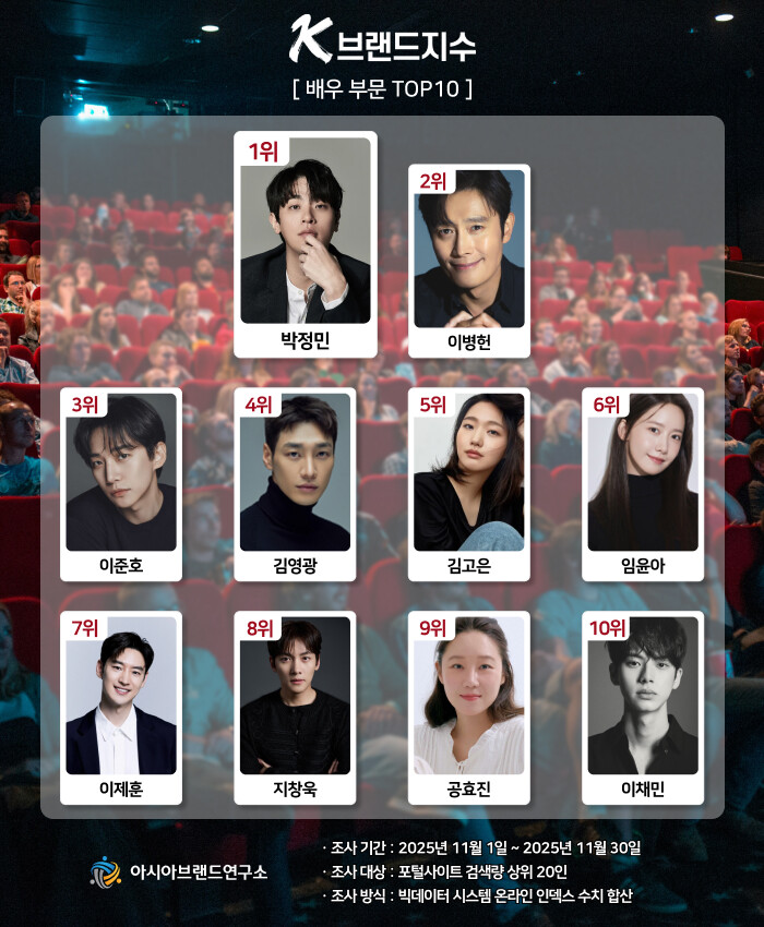 이번 K-브랜드지수 배우 부문은 포털사이트 검색량 상위 20인을 대상으로, 2025년 11월 1일부터 11월 30일까지의 온라인 빅데이터 3319만 2605건을 분석했다.