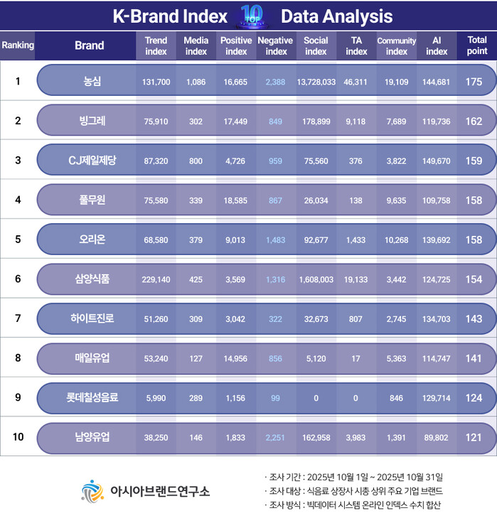 이번 K-브랜드지수 식음료 상장사 부문은 식음료 상장사 시총 상위 주요 기업 브랜드를 대상으로, 2025년 10월 1일부터 10월 31일까지의 온라인 빅데이터 4545만 1754건을 분석했다.