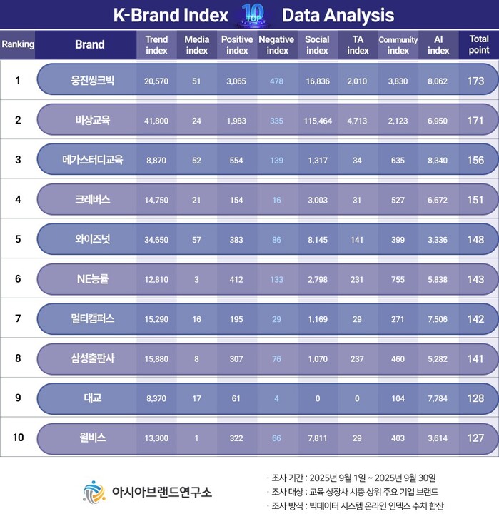 이번 K-브랜드지수 교육 상장사 부문은 교육 상장사 시총 상위 주요 기업 브랜드를 대상으로, 2025년 9월 1일부터 9월 30일까지의 온라인 빅데이터 51만 9710건을 분석하여 진행됐다.