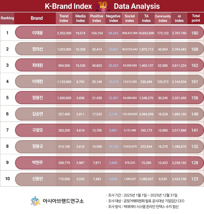 한정근 아시아브랜드연구소 대표는 “이번 K-브랜드지수 올해의 CEO 부문은 단순한 기업 규모보다 개인의 이슈 대응력과 대외 메시지 노출 방식이 순위 변동에 직접적인 영향을 미친 것으로 분석된다. 정의선 현대차 회장과 최태원 SK 회장의 순위 변화는 산업 이슈와 글로벌 행보에 대한 온라인 반응 차이가 반영된 결과로 볼 수 있다”고 설명했다.