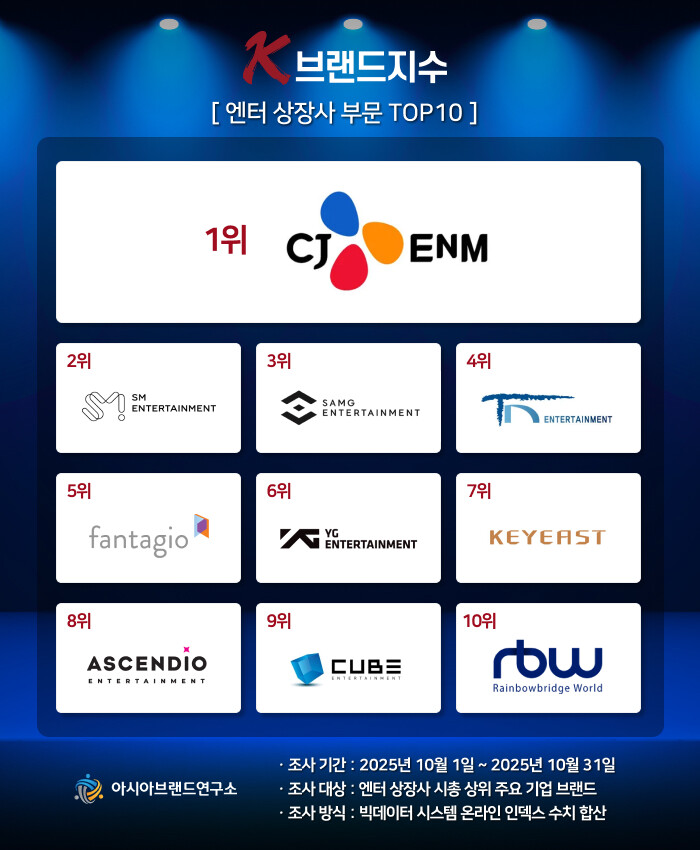 K-브랜드지수 엔터 상장사 부문에서 CJ ENM이 또 다시 1위에 등극했으며, 에스엠(2위), SAMG엔터(3위), 티엔엔터테인먼트(4위), 판타지오(5위), 와이지엔터테인먼트(6위), 키이스트(7위), 아센디오(8위), 큐브엔터(9위), 알비더블유(10위)가 TOP10에 이름을 올렸다.