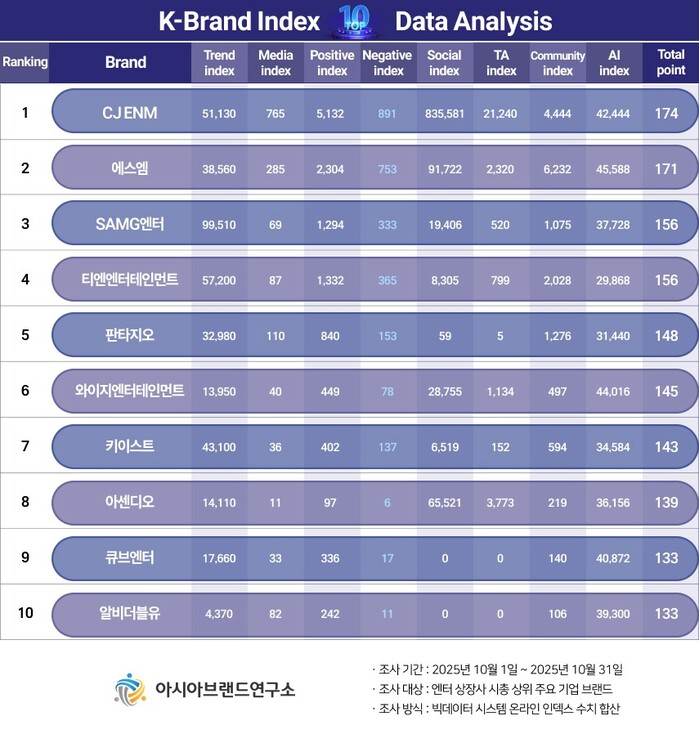 이번 K-브랜드지수 엔터 상장사 부문은 엔터 상장사 시총 상위 주요 기업 브랜드를 대상으로, 2025년 10월 1일부터 10월 31일까지의 온라인 빅데이터 262만 4442건을 분석했다.