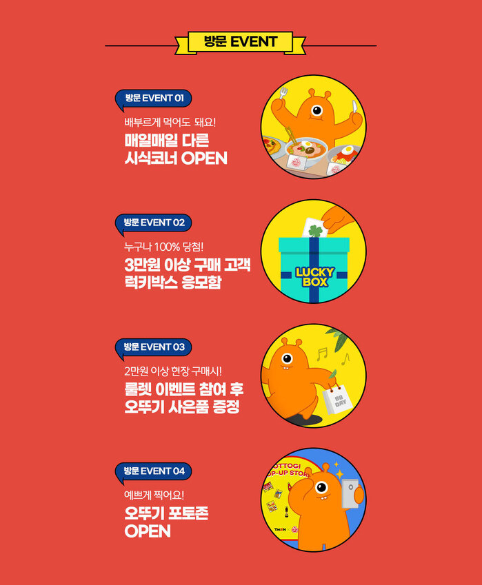 또, ▲이벤트존에서는 구매 고객 대상 럭키박스 응모함, 룰렛 이벤트를 열어 풍성한 경품을 지급한다. 오뚜기 캐릭터와 사진 촬영을 할 수 있는 ▲포토존에서 SNS 인증샷을 남기면 사은품도 증정한다. 10일 오후 12시에는 오뚜기 푸드트럭이 깜짝 방문해 피자, 프로틴음료 시식 행사도 열린다.