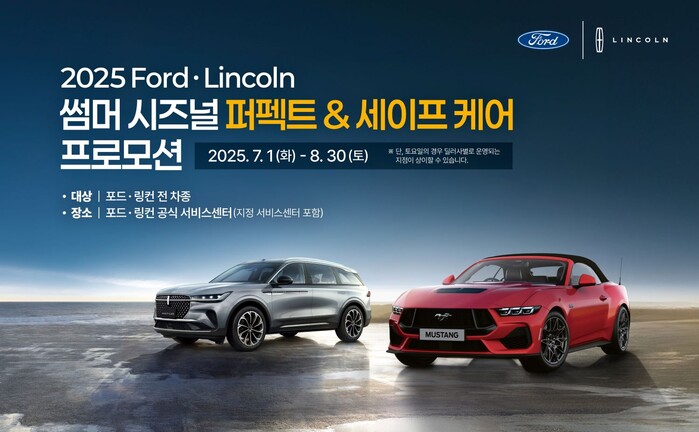 [메가경제=주영래 기자] 포드세일즈서비스코리아(이하 포드코리아)는 여름 시즌을 맞아 7월 1일부터 8월 30일까지 전국 포드·링컨 공식 딜러사 서비스센터 및 지정 서비스센터에서 포드와 링컨 전 차종을 대상으로 ‘2025 포드·링컨 썸머 시즈널 퍼펙트 & 세이프 케어 프로모션’을 실시한다.