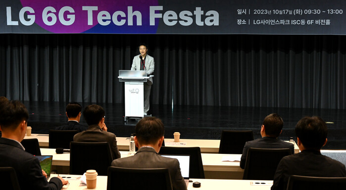 ▲ LG전자가 LG유플러스와 함께 국내외 전문가 및 파트너들을 초청한 가운데, 서울 마곡 LG사이언스파크에서 6G 통신분야 R&D 성과를 교류하는 LG 6G 테크 페스타를 열었다. LG전자 CTO(최고기술책임자) 김병훈 부사장이 행사 참석자들에게 환영사를 전하고 있다. [사진=LG전자] |