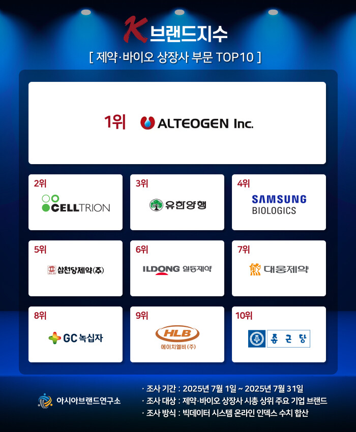 K-브랜드지수 제약·바이오 상장사 부문은 알테오젠이 1위를 탈환했으며, 셀트리온(2위), 유한양행(3위), 삼성바이오로직스(4위), 삼천당제약(5위), 일동제약(6위), 대웅제약(7위), 녹십자(8위), 에이치엘비(9위), 종근당(10위)이 TOP10을 차지했다.