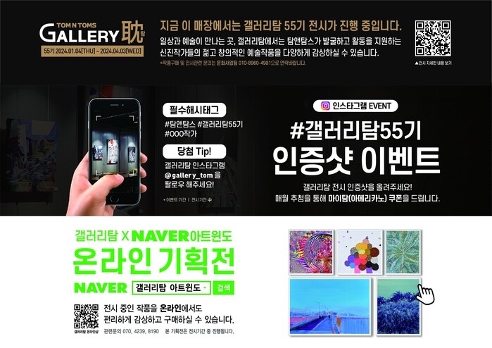 갤러리탐의 공간적 한계를 보완하는 온라인 프로모션도 함께 진행된다. ‘네이버 아트윈도' 내 갤러리탐 55기 온라인 기획전을 방문하면 전시 작품들을 언제 어디서나 편하게 감상할 수 있다. 온라인 기획전에서는 합리적인 가격으로 원하는 작품을 구매하거나 작가 친필 서명이 담긴 작품 보증서, 포토/영상 리뷰 작성 네이버페이 포인트 등의 특별 혜택을 누릴 수도 있다.