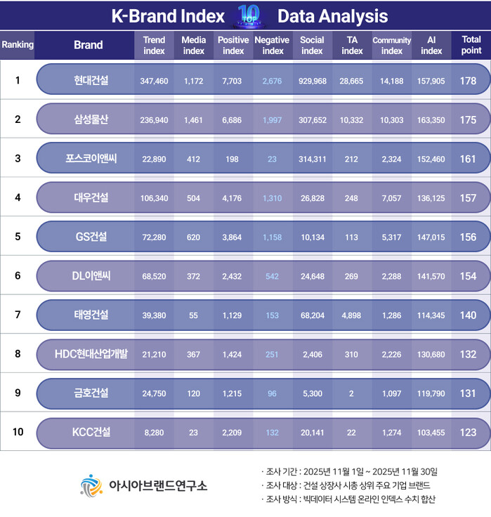 이번 K-브랜드지수 건설 상장사 부문은 건설 상장사 시총 상위 주요 기업 브랜드를 대상으로, 2025년 11월 1일부터 11월 30일까지의 온라인 빅데이터 523만 1259건을 분석했다.